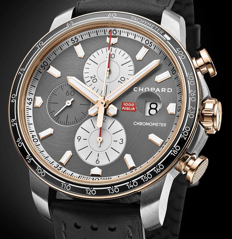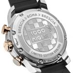 Ljubitelji bencinskih hlapov bodo pozdravili gumbe kronografa zasnovane v stilu ”batov” ter krono z odtisom volanskega obroča. Zadnjo stran ohišja obdaja pokrov z gravuro logotipa dirke ter številko ure iz omejene serije. Pri tem ne gre zanemariti, da ohišje omogoča do 100 metrov vodotesnosti. Na sivi številčnici s krožno brušenimi vzorci izstopata bela števca kronografa, datum ob 3.uri ter rdeč logotip 1000 Miglia.
