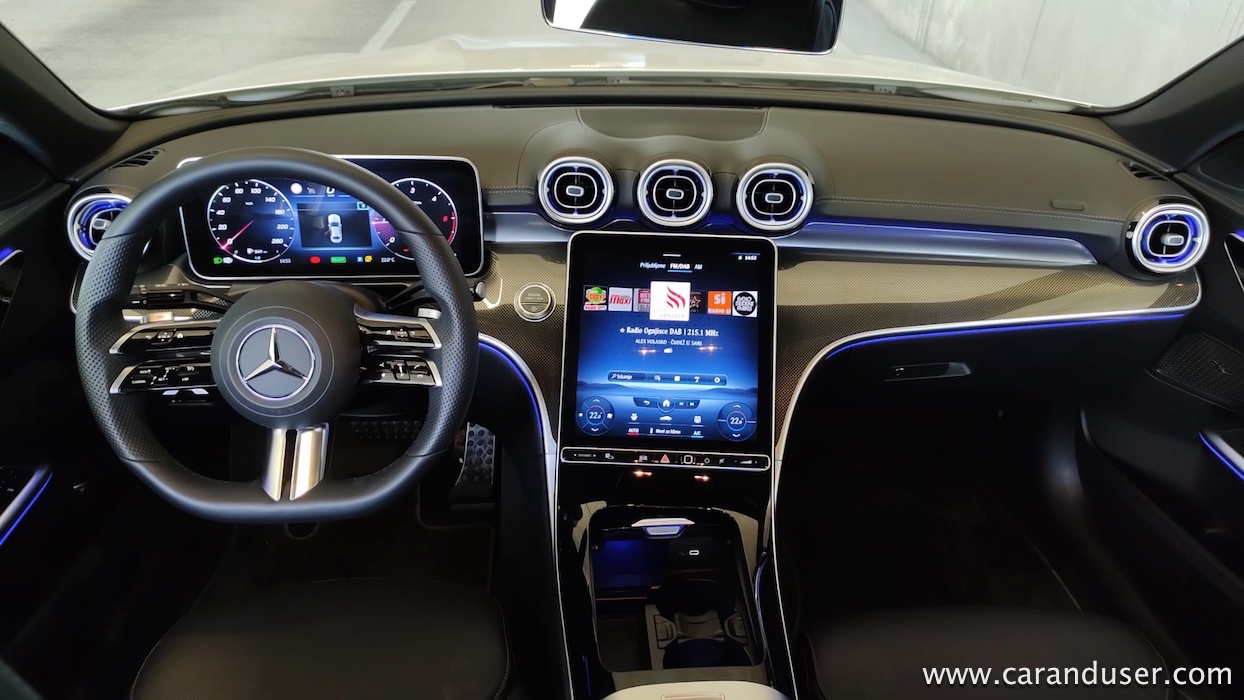 Osrednja in morda najbolj kontroverzna točka novega C je zagotovo notranjost. Ponovno se oblikovno naslanja na večjega razred S, kjer v slogu novih smernic najdemo pokončen sredinski zaslon, ločene digitalne merilnike, novo oblikovanje zračnikov in nenazadnje, pomanjkanje fizičnih gumbov. Z najnovejšim MBUX informacijsko-zabavnim vmesnikom upravljamo preko osnovnih 10,25- in 9,5-palčnih zaslonov ali večjih 12,3- in 11,9-palčnih enot. Moderno kabino zaokrožuje izbira različnih oblazinjenj in dodatkov ter ambientalna osvetlitev.