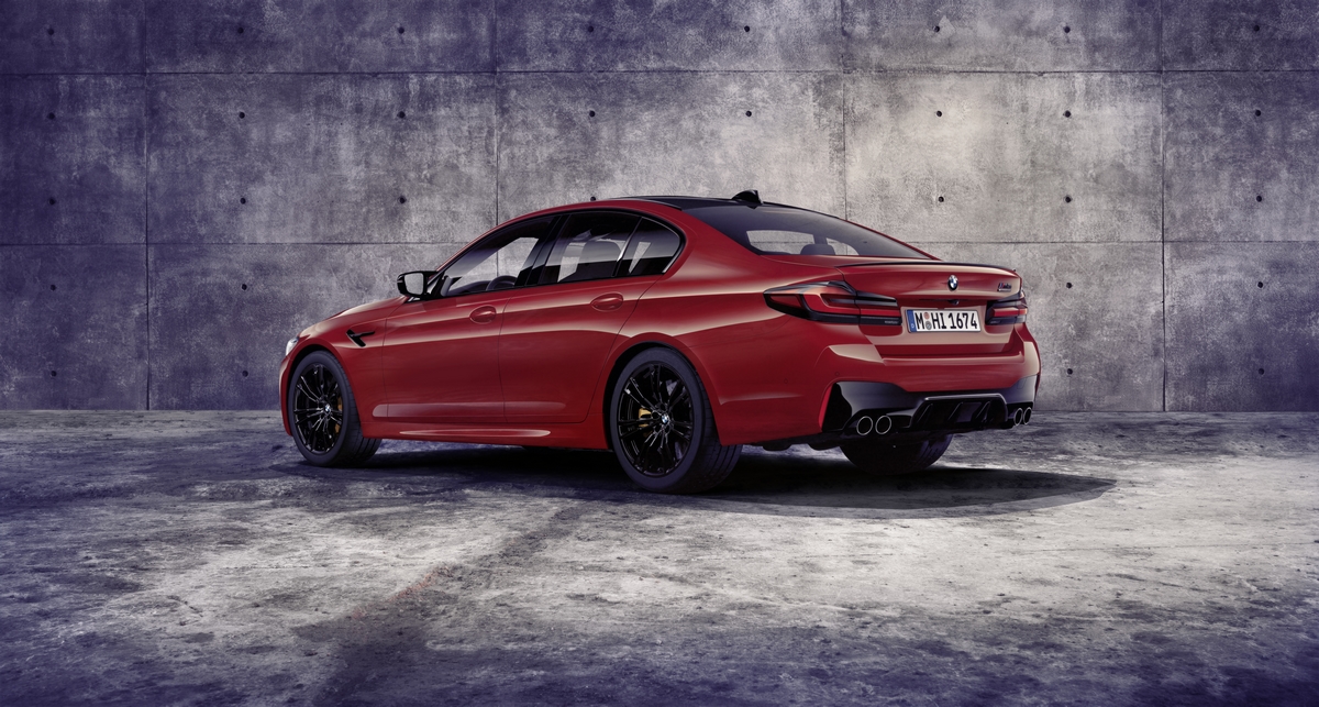 Kot vsak model do sedaj bo M5 bistveno širši in bolj postaven od klasične serije 5, kar pozitivno vpliva na krmiljenje in stabilnost pri visoki hitrosti. Kolesni loki so močno poudarjeni, medtem ko so bočne linije s skritimi kljukami vrat precej elegantne. Razvojni primerek nosi napis »hibridno testno vozilo«, kar kaže na priključno-hibridno naravo pod površjem, očitna so tudi polnilna vratca za sprednjimi kolesi. Tradicija ostaja v obliki dveh parov izpušnih cevi zadaj, umeščenih v izrazito oblikovan zadnji odbijač, tako kot spredaj sta tudi zadnji luči veliko tanjši kot poprej.