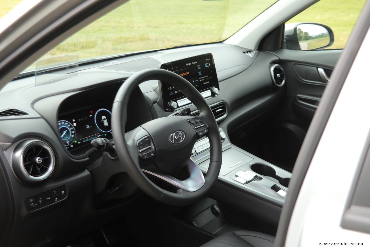 Kona Electric ima tri zelo značilne načine vožnje: Eco, Normal in Sport. Odzivnost se med tremi različicami opazno spreminja, prav tako se spremeni živahnost grafik na posodobljenem digitalnem prikazovalniku instrumentov. Celoten zaslon, ki se ob izbiranju športnega načina obarva rdeče, vzbuja nasmeh in je dobrodošel odmerek značaja v kabini, ki je bolj funkcionalna kot elegantna. Vseeno gre pohvaliti odmik od sodobnega minimalizma, namreč v notranjosti se že po prvi vožnji počutite kot doma, saj je vse razporejeno z mislijo na uporabnika, s pregledno postavitvijo in fizičnimi hitrimi gumbi za najpomembnejše funkcije.