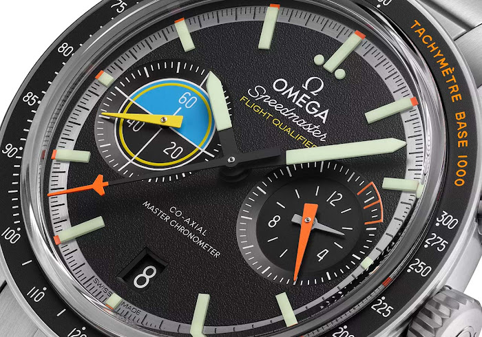 Ob 3. uri sta 60-minutni in 12-urni prikaz kronografa oblikovana tako, da spominja na števec stopnje izgorevanja, ki ga najdemo v letalskih kabinah, k čemur botruje mat oražen kazalec. Ob 9. uri se nahaja podštevilčnica s tekočimi sekundami, ki z mat rumenim kazalcem in umetnim obzorjem v modri barvi, spominja na števec cilja/vidnosti.