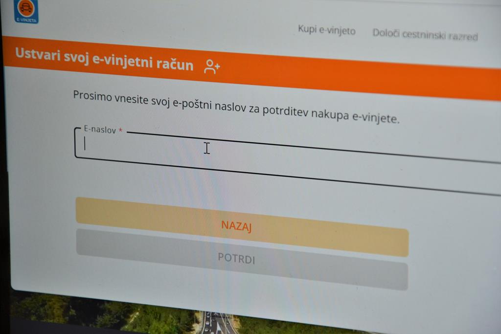 Ko izberete oba parametra e-vinjete (razred in obdobje), vas sistem preusmeri na naslednji korak, kjer ustvarite svoj e-vinjetni račun. V okence vpišete vaš elektronski naslov, na katerega vam po kliku na gumb ”Potrdi”, pošljejo varno povezavo za nadaljevanje nakupa.