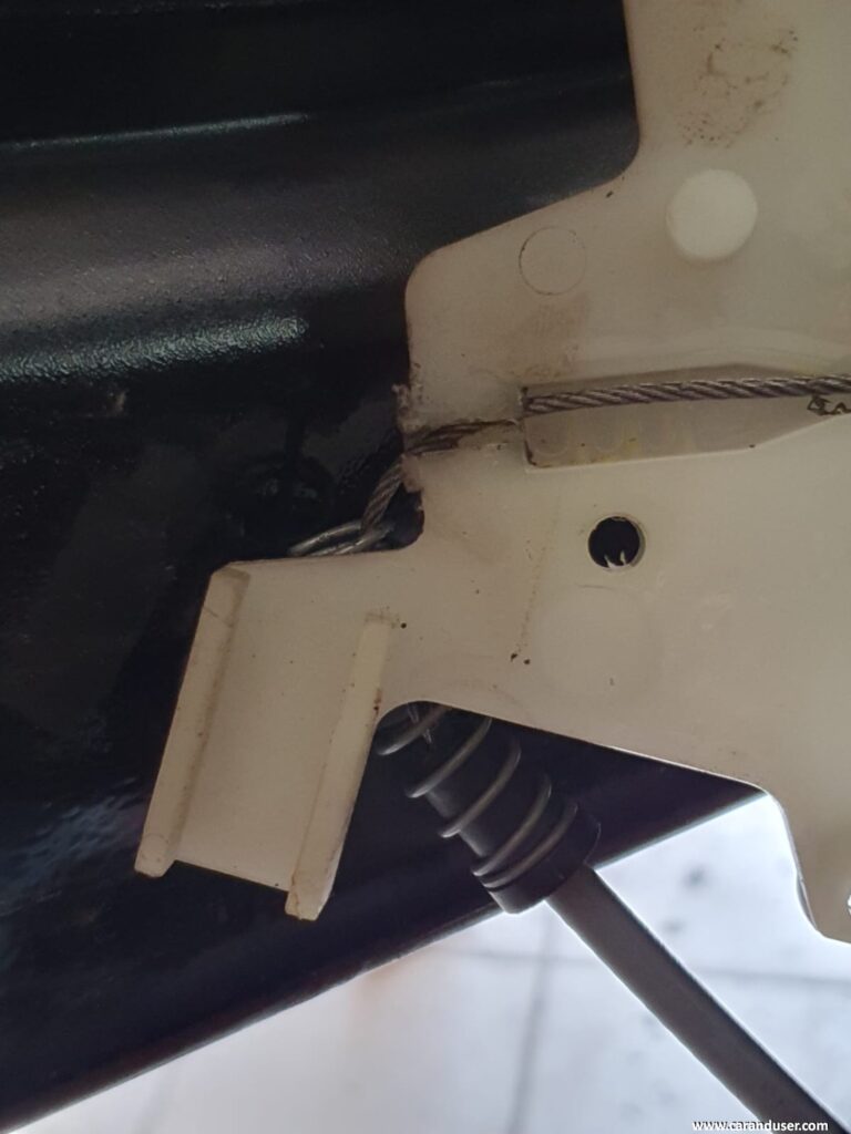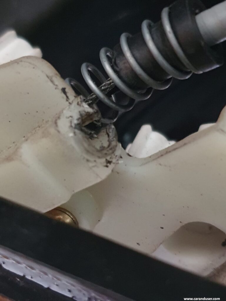 Tretje opravilo na seznamu je bil poškodovan mehanizem odpiranja predala za rokavice na sovoznikovi strani, kar sicer ne vpliva na kakovost vožnje, je pa vsekakor nevšečnost, saj je predal tako neuporaben. Sama izvedba popravila ni bila sila zahtevna, rešili smo jo s popravilom obstoječe ročice, s čimer smo privarčevali kakšen kovanec.
