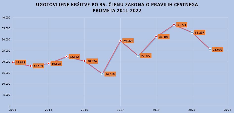 V letu 2022 je policija ugotovila 25.670 kršitev po 35. členu Zakona o pravilih cestnega prometa, ki prepoveduje uporabo naprav ali opreme, ki zmanjšujejo voznikovo slušno ali vidno zaznavanje ali zmožnost obvladovanja vozila. V letu pred tem je bilo takšnih kršitev kar 33.297 oziroma za skoraj četrtino več. Trend upada je mogoče pripisati poostreni zakonodaji, nadzoru policije in ozaveščanju agencije skozi vse leto.