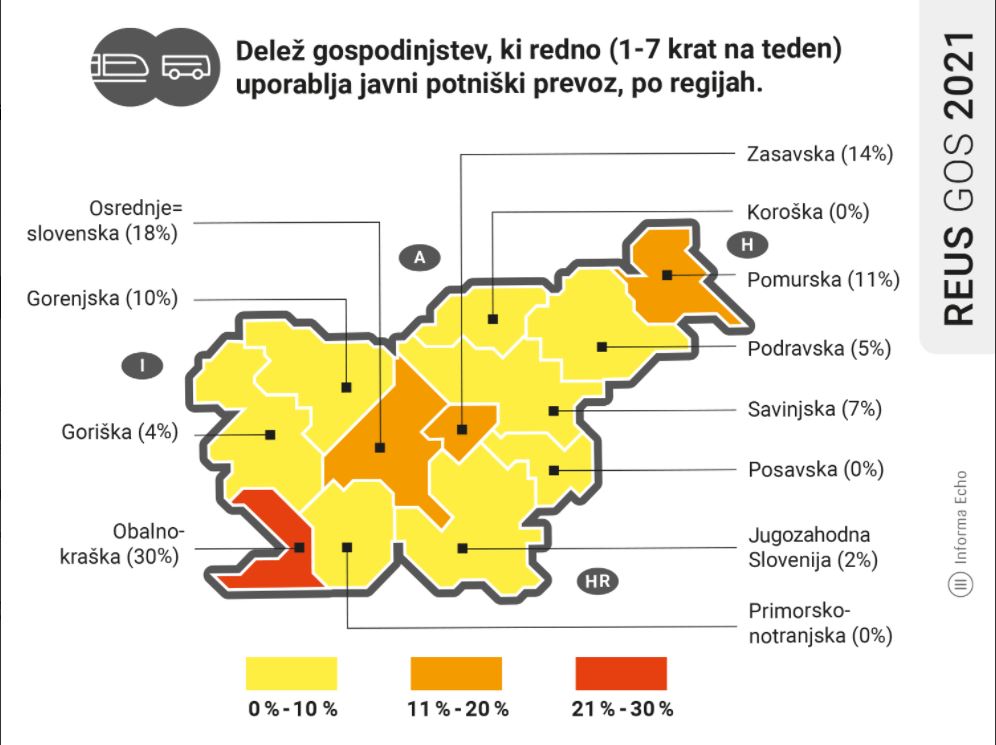 Raziskava energetske učinkovitosti Slovenije – REUS 2021 kaže, da le majhen delež gospodinjstev redno uporablja javni potniški prevoz (JPP), pri čemer ga redno (1-7-krat tedensko) uporabljajo gospodinjstva v Ljubljani in Mariboru ter v Obalno-kraški regiji. Glede na zadnjo uporabo so člani gospodinjstev javni potniški prevoz uporabili predvsem za opravke in nakupe ter pot na delo.
