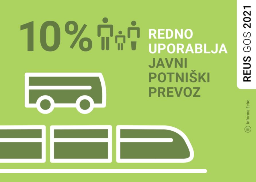Rezultati raziskave REUS 2021 kažejo, da več kot četrtina (27 %) gospodinjstev nikoli ne uporablja javnega potniškega prevoza, dobra polovica (53 %) gospodinjstev ga uporablja zelo redko, desetina (10 %) občasno, samo desetina (10 %) gospodinjstev pa ga uporablja redno (1-7 krat tedensko).