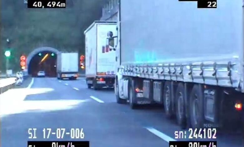 Šofer tovornjaka namesto predpisanih 100 vzdrževal le 5 metrov "varnostne" razdalje