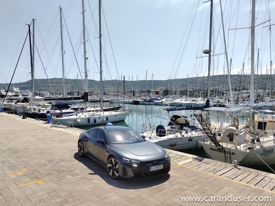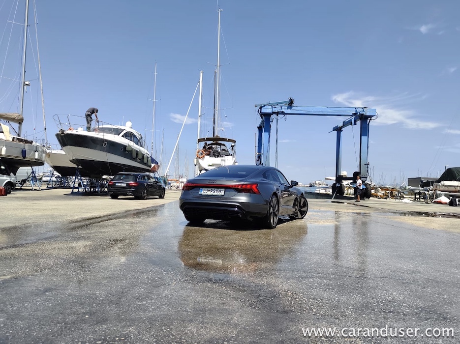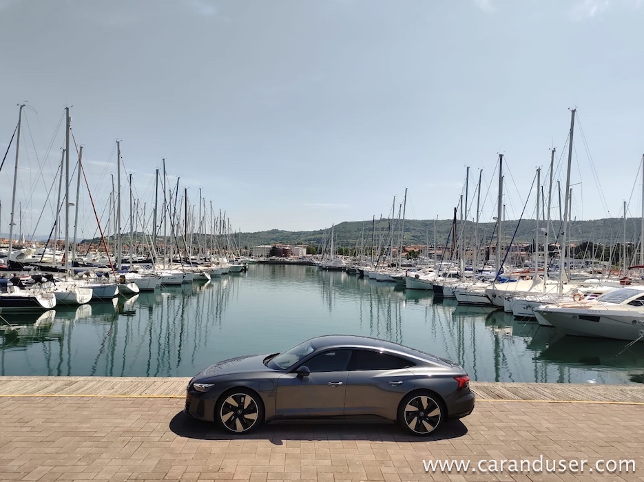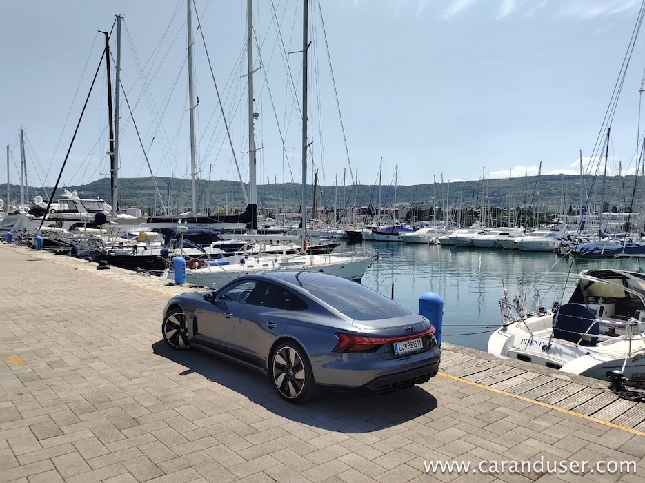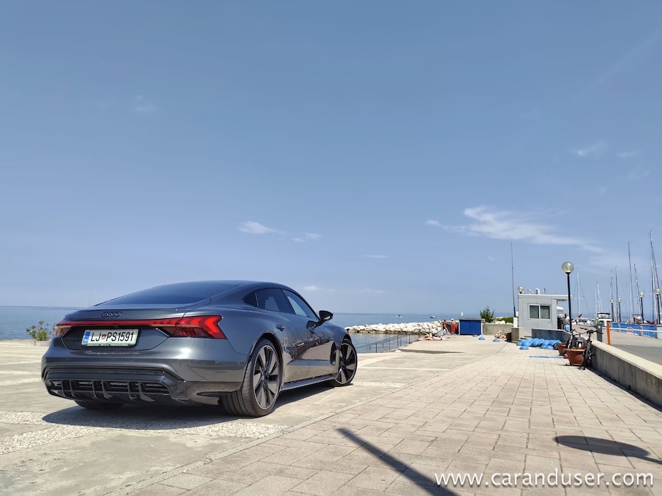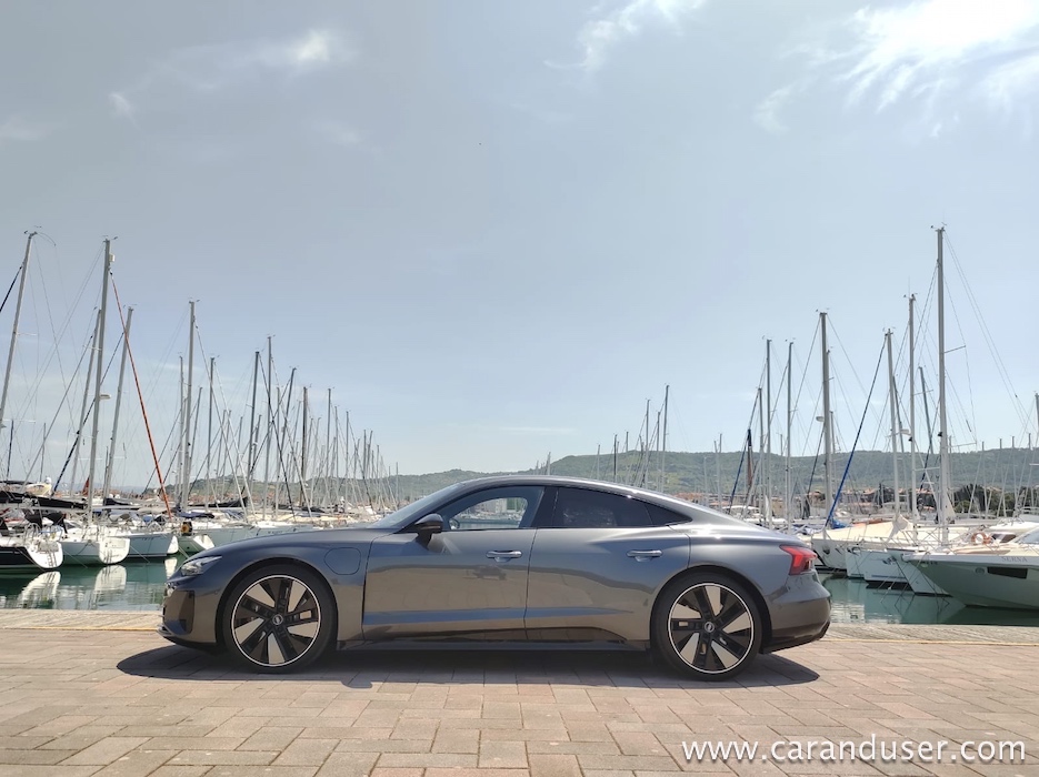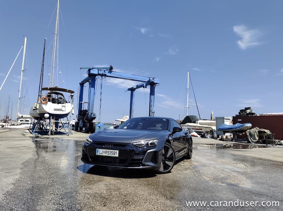 Verjetno se vam že počasi svita, da je Audi bolj hiter GT, in ne štirisedežen superšportnik kot je Taycan. Takšno teorijo potrjujejo tudi njegove mere, e-tron je nekoliko daljši, malenkost ožji in rahlo višji, več je prtljažnega prostora – 405 litrov zadaj in 85 litrov v nosu. Pod zunanjostjo se skriva aluminijasto »double-wishbone« vpetje, elektronsko nadzorovan zadnji diferencial in adaptivno zračno vzmetenje, opcijsko ga lahko obogatimo s štirikolesnim krmiljenjem in futurističnim »e-tron sport« zvokom. Zaradi nizko nameščenega baterijskega sklopa ima boljše težišče od superšportnega R8. Serijski zaviralni sistem sestavljajo jekleni diski z volfram-karbidno prevleko, na izbiro so tudi karbon-keramične zavore.