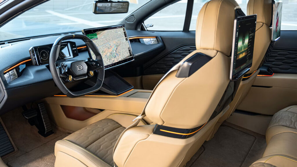 Za zajetnimi galebjimi vrati se skriva udobna kabina s petimi sedeži in številnimi zasloni – dva skrbita za prikaz slike digitalnih zunanjih ogledal, dva predvajata zabavno vsebino potnikom na zadnjih sedežih, osrednji je 17,1-palčni informacijski zaslon na dotik, pred voznikom pa se nahajajo digitalni merilniki. Voznik lahko vse funkcije upravlja preko tipk na volanu, podobnega pristopa smo že vajeni pri nekaterih avtomobilih slovitih italijanskih znamk.