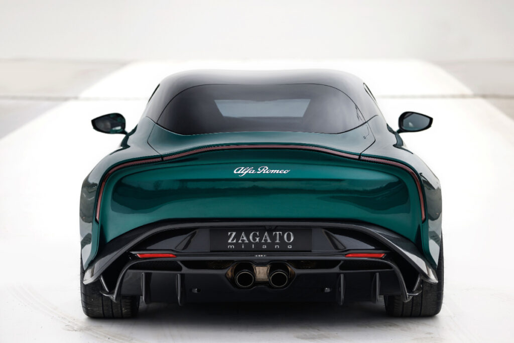 Poslovila so se štiri vrata, Giulia SWB Zagato je tako klasičen kupe z dolgimi vrati, ki se odpirajo z manjšim gumbom skritim v B stebričku. Čudovita linija se zaključi s strmo odrezanim zadkom, katerega krasijo vzdolžen svetilni element, globok karbonski difuzor in dve sredinsko nameščeni izpušni cevi. Pod pokrovom motorja tiči prepoznaven 2,9-litrski V6 z dvema tubopolnilnikoma, ki ustvari še neznano število konjenice, a že v standardnem GTAm zmore 540 KM in 600 Nm navora. Moč se vselej prenaša na zadnji kolesni par, vendar namesto osemstopenjskega samodejnega, preko šeststopenjskega ročnega menjalnika.