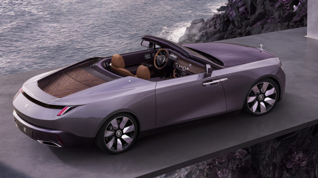 Leseni dekor in vijolična barva narekujeta pot tudi v ambientu vozila. Tam se v osrednji konzoli tokrat nahaja ročna ura butičnega švicarskega proizvajalca Vacheron Constantin, ki je sodeloval z Rolls Roycem in v odstranljiv ročni nakit vključil barvo ametista na belo-zlati osnovni plošči. Pravzaprav je celotno osrednjo armaturno ploščo izdelal drugi najstarejši švicarski proizvajalec ur iz Ženeve. Lahko še kaj dodamo? Veliko ali pa nič. Uživajte ob ogledu foto galerije …