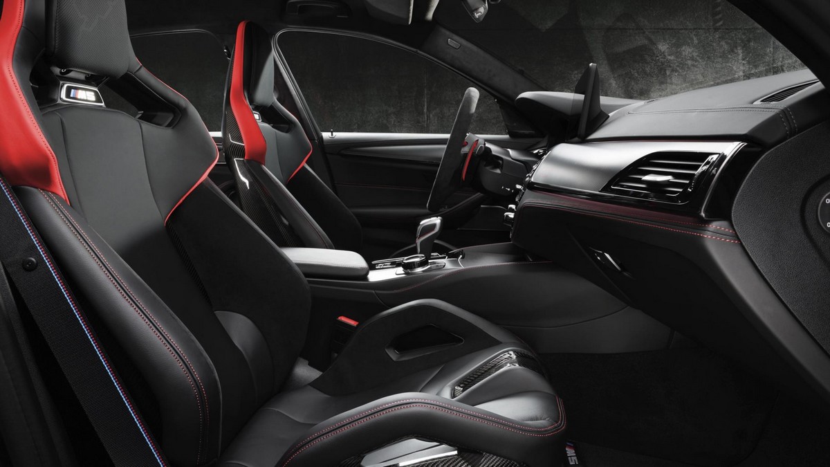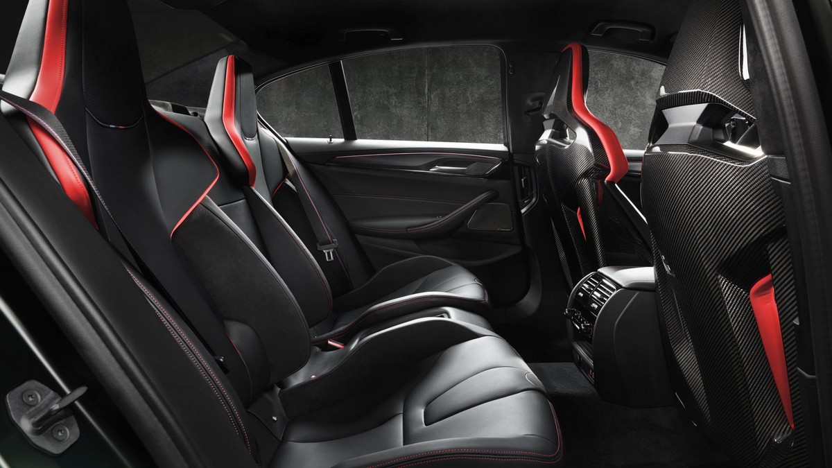 Veliko je k izboljšavi zgornjih številk pripomogla izguba odvečne mase, v primerjavi s standardnim Competition je odvrgel 70 kilogramov. Največ prihranka prinašajo zunanje komponente iz karbonskih vlaken in štirje karbonski dirkaški sedeži v notranjosti. Tako je, M5 CS je izključno štirised.