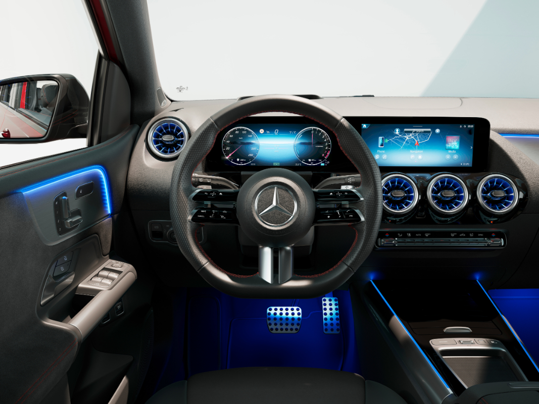 Informacijski sistem sestavljata dva zaslona, standardno 7-palčni digitalni merilniki in 10,25-palčni osrednji zaslon, z doplačilom oba merita 10,25-palcev, v ozadju se nahaja nova generacija MBUX programske opreme. Sistem je bolj odziven kot prej in ima vgrajen čitalec prstnih odtisov za hitrejšo prepoznavo voznika, več funkcij zmore opravljati tudi glasovni asistent aktiviran s »Hey Mercedes«. Kabina je lahko po novem prevlečena v Artico umetno usnje različnih barv, AMG Line modeli se pohvalijo s semišem in rdečimi šivi.