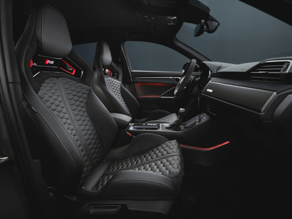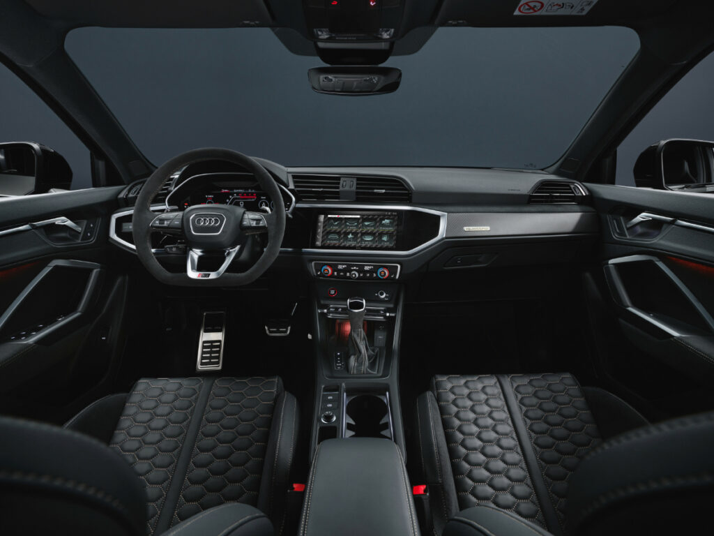 V notranjosti so RS Q3 Edition 10 Years namenili ekskluzivne RS školjkaste karbonske športne sedeže, sicer se nadaljuje črna tematika pri oblazinjenju v kombinaciji usnja in materiala dinamica, monotonost nekoliko razbijejo šivi v bakrenem odtenku ter nekaj rdečih površin. Predpražniki so okrašeni z RS Q3 napisom, na številčno omejitev serije spominjajo tudi digitalni merilniki.