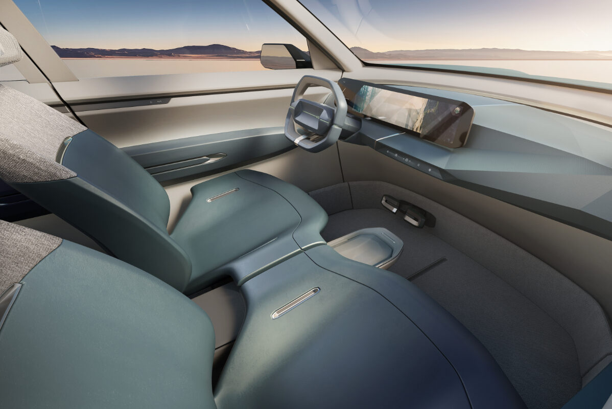 Oblikovalci so se notranjosti lotili mislijo na lahkotnost, intuitivno uporabo in prostornost, saj je dno popolnoma izravnano ter poskrbi za udobje potnikov. Prav tako so z izbiro barv in materialov kabine ustvarili prijeten ambient, brez raznih nepotrebnih fizičnih gumbov. Osrednji del armaturne plošče zastopa panel z dvema širokima zaslonoma, kjer se prikazujejo vse potrebne informacije in zabavne vsebine. Kot pri EV9, so vključili inovativne vrteče sedeže za večje udobje med čakanjem na polnjenje ali ob izletu v naravi, velika posebnost je tudi panoramska streha s sončnimi paneli. Skladno z novimi ekološkimi načeli je zajetno število notranjih materialov trajnostnih, izdelanih iz rastlinskih surovin ali recikliranih PET plastenk.