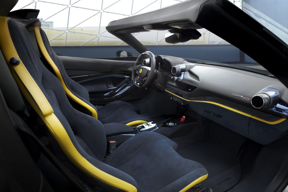 V notranjosti je bila osrednja konzola prilagojena za nastavitve v slogu dirkalnika Formule 1 s posebej spremenjenim vzorcem izbirnika smeri vožnje. Nameščena sta bila športna sedeža z lasersko vrezanimi detajli iz mornarsko modre Alcantare in tkanino z gradientnim učinkom ter preprogami iz posebne pletene tkanine. Ferrari SP-8 bo od 24. oktobra 2023 do konca dirke Finali Mondiali Ferrari 2023 razstavljen na dirkališču Mugello, nato pa bo od 16. novembra do marca prihodnje leto krasil Ferrarijev muzej v Maranellu.