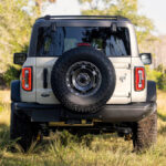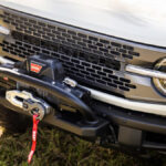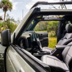 Največja sprememba se je zgodila na sprednjem delu Bronca, kjer najdemo novo masko in seveda Safari cevna zaščita z vitlom, ki zmore povleči kar 4.500-kilogramsko breme. Vsi smo zagotovo takoj opazili tudi pridobitev oddušnika, nameščenega na sprednjem stebričku, z dvema stopnjama delovanja, saj lahko glede na vremenske razmere onemogoča vstop vode ali prahu v sistem. Skladno z novim snorklom, so Fordovi inženirji privzdignili položaj zračnih kanalov na sprednji in zadnji osi, prenosnika moči ter menjalnika. Rezultat je Bronco, ki lahko brez težav brodi po vodi do globine enega metra.