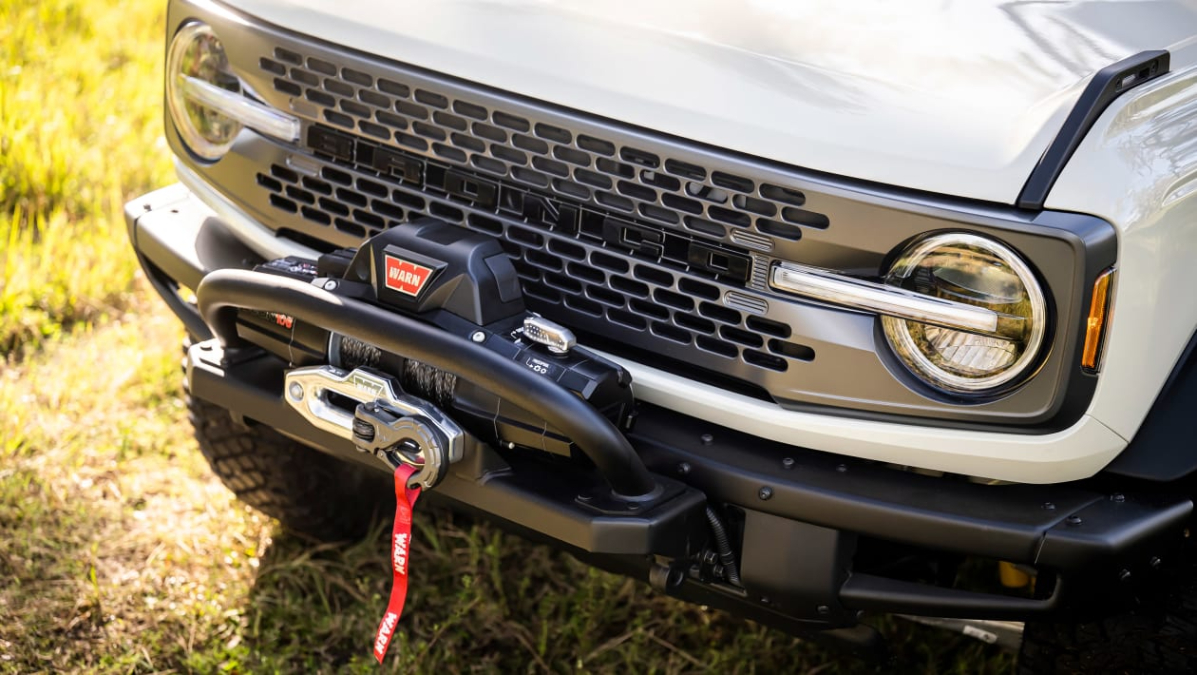 Največja sprememba se je zgodila na sprednjem delu Bronca, kjer najdemo novo masko in seveda Safari cevna zaščita z vitlom, ki zmore povleči kar 4.500-kilogramsko breme. Vsi smo zagotovo takoj opazili tudi pridobitev oddušnika, nameščenega na sprednjem stebričku, z dvema stopnjama delovanja, saj lahko glede na vremenske razmere onemogoča vstop vode ali prahu v sistem. Skladno z novim snorklom, so Fordovi inženirji privzdignili položaj zračnih kanalov na sprednji in zadnji osi, prenosnika moči ter menjalnika. Rezultat je Bronco, ki lahko brez težav brodi po vodi do globine enega metra.