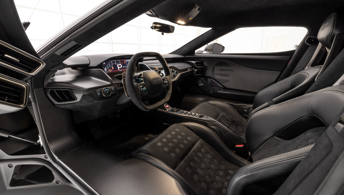 V notranjosti ga bomo od povprečnega GT-ja ločili po radodarni količini karbonskih vlaken – pragovi, armaturna plošča, sredinska konzola in vstavki vrat z dodatkom dirkaške številke 5. Tudi školjkasta sedeža sta izdelana iz karbona, vendar sta zaradi udobja oblečena v kombinacijo alkantare in usnja, celotno kabino pa povežejo zlati šivi. Zlata tematika je vidna tudi na različnih gumbih, stikalnih in nenazadnje na zlato obarvanih obvolanskih prestavnih ročicah.