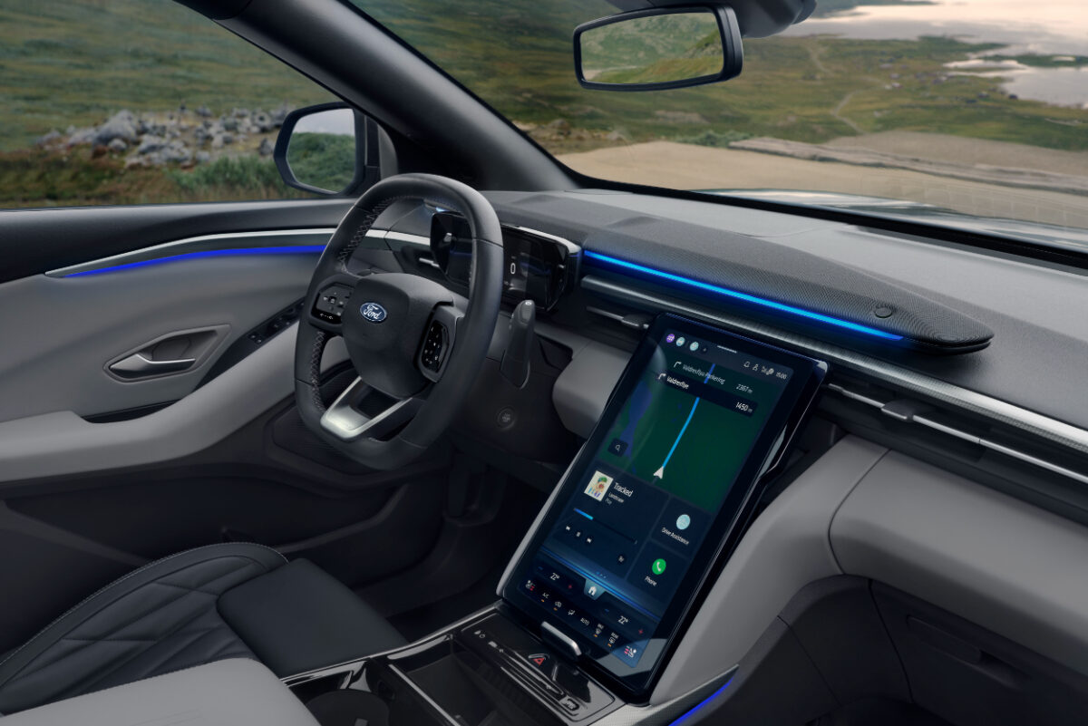 Vrh armaturne plošče serijsko krasi vzdolžen zvočnik z 10-barvno ambientalno osvetlitvijo, ki prilagaja barve glede na izbiro voznega profila, pred vznikom pa se nahaja manjši 5-palčni zaslon z najnujnejšimi podatki o vožnji. Ford si močno prizadeva kabino odeti v čim bolj prijetne in mehke kakovostne materiale, kar je šibka točka nemškega konkurenta. Praktično bo izredno težko najti skupne točke obeh notranjosti, z izjemo vrtljivega izbirnika smeri vožnje, tipk za prižig luči in stikala za odpiranje oken.