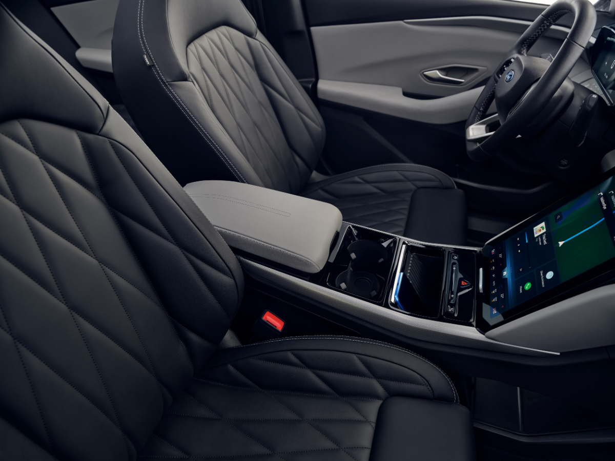 Vrh armaturne plošče serijsko krasi vzdolžen zvočnik z 10-barvno ambientalno osvetlitvijo, ki prilagaja barve glede na izbiro voznega profila, pred vznikom pa se nahaja manjši 5-palčni zaslon z najnujnejšimi podatki o vožnji. Ford si močno prizadeva kabino odeti v čim bolj prijetne in mehke kakovostne materiale, kar je šibka točka nemškega konkurenta. Praktično bo izredno težko najti skupne točke obeh notranjosti, z izjemo vrtljivega izbirnika smeri vožnje, tipk za prižig luči in stikala za odpiranje oken.