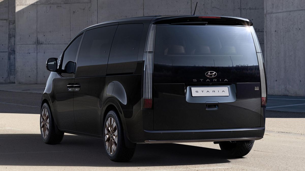 Staria je bil oblikovan z eno preprosto tekočo silhueto, raztegnjeno od sprednjega dela, vse do zadka. Spredaj ga definira čez celotno širino razprostrta dnevna LED osvetlitev in mogočna maska z dvema žarometoma ob robu. Linija se nato hitro in elegantno v loku dviga proti zadku, s pokončnimi prtljažnimi vrati, katere ob straneh osvetljujeta dva vertikalna svetilna elementa. Z obeh strani lahko najdemo drsna vrata in privlačna 18-palčna platišča.