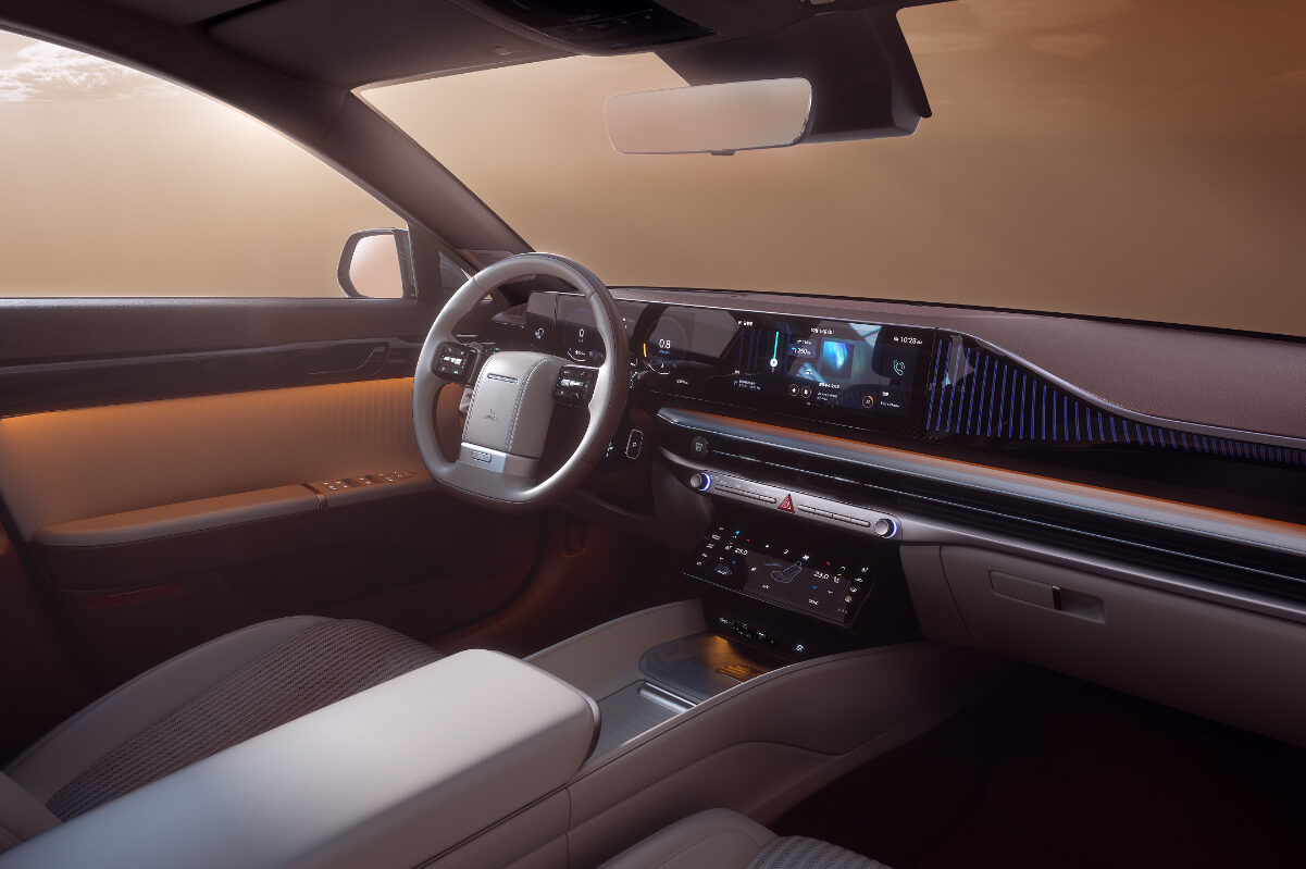 Tako kot zunanjost, se tudi notranjost precej odmika od prejšnje generacije. Ponaša se z elegantno zasnovano armaturno ploščo z dvema glavnima zaslonoma, tretji za namene klimatske naprave je nameščen nad sredinsko konzolo. Oblikovanje volana tako kot nekateri zunanji elementi spominja na prvega Grandeurja. Ambient v kabini privzdigne osvetlitev vrat, za udobje bo skrbelo kakovostno Nappa usnje v kombinaciji z antibakterijskim usnjem na dotičnih površinah. Podrobnejše informacije, predvsem kaj tiči pod dolgim pokrovom motorja, bomo izvedeli v prihajajočih tednih.
