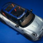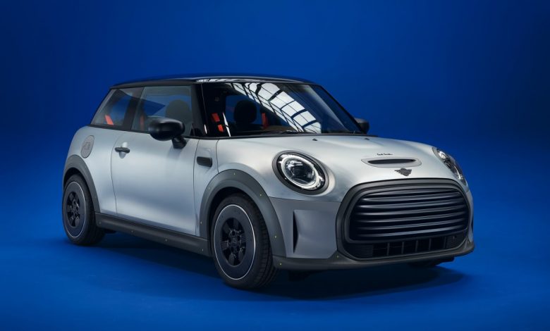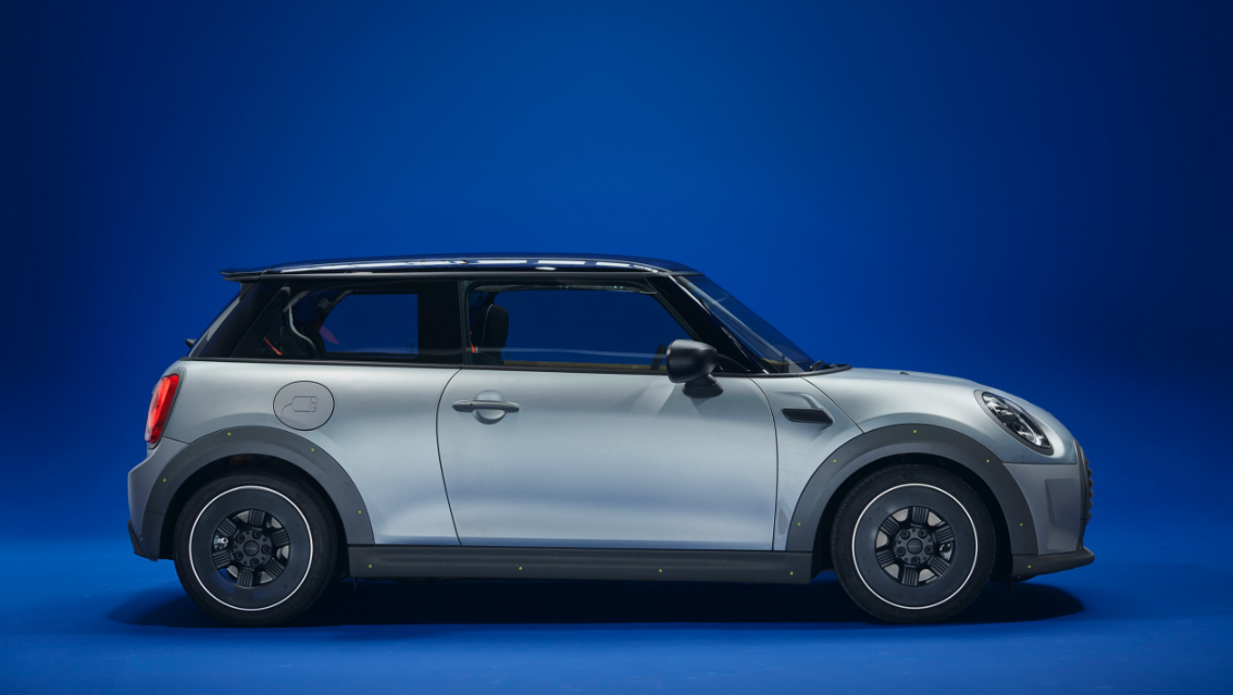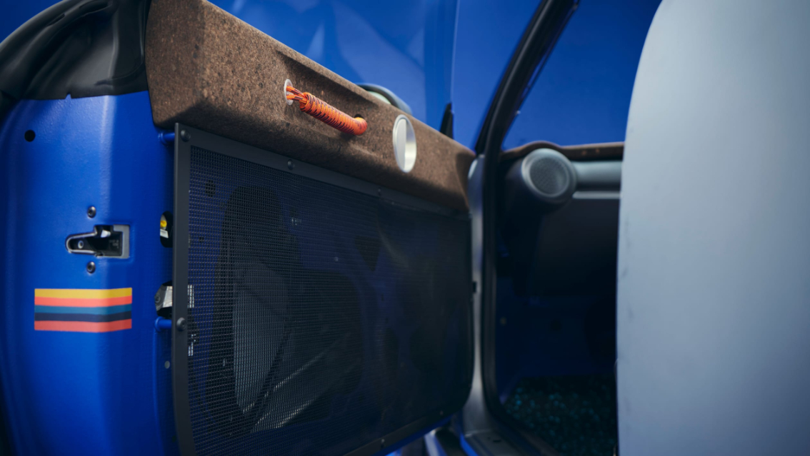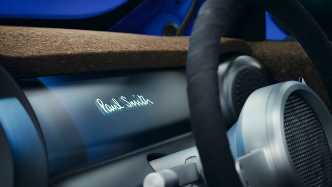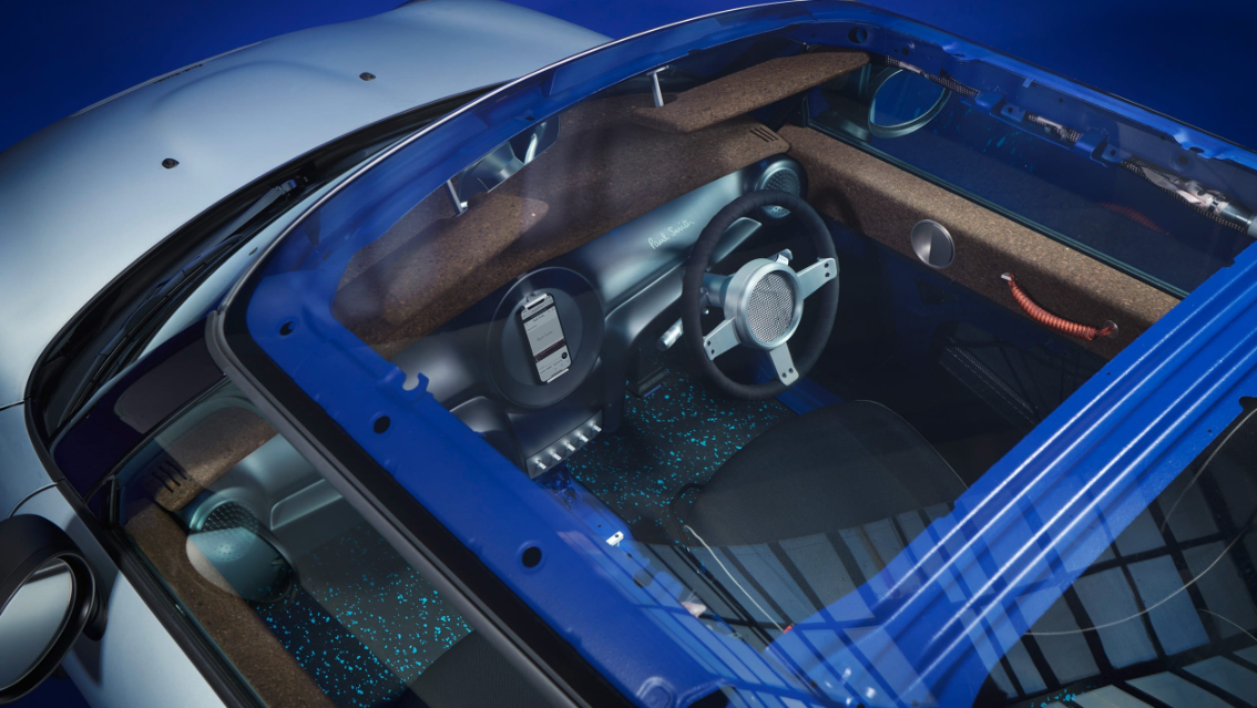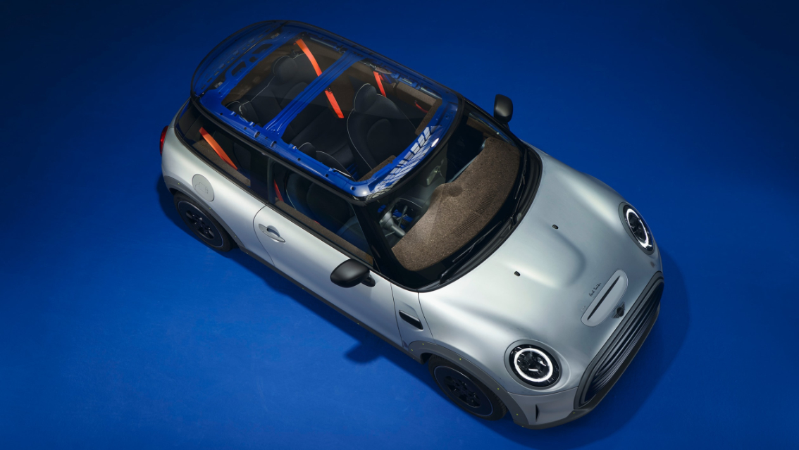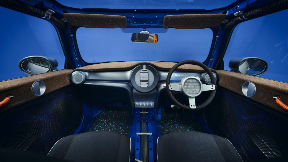 Smith se je pri kreiranju odločil za mnoge reciklirane in okolju prijazne materiale. Rjava površina na armaturni plošči in vratih je reciklirana pluta, usnja ni, tepihi so iz reciklirane gume. Stebrički in streha so gola kovina odeta le v modro kovinsko barvo – spominjalo naj bi na notranjost klasične obleke. Kaj menimo? Očem prijaznejše od standardnega električnega Minija?