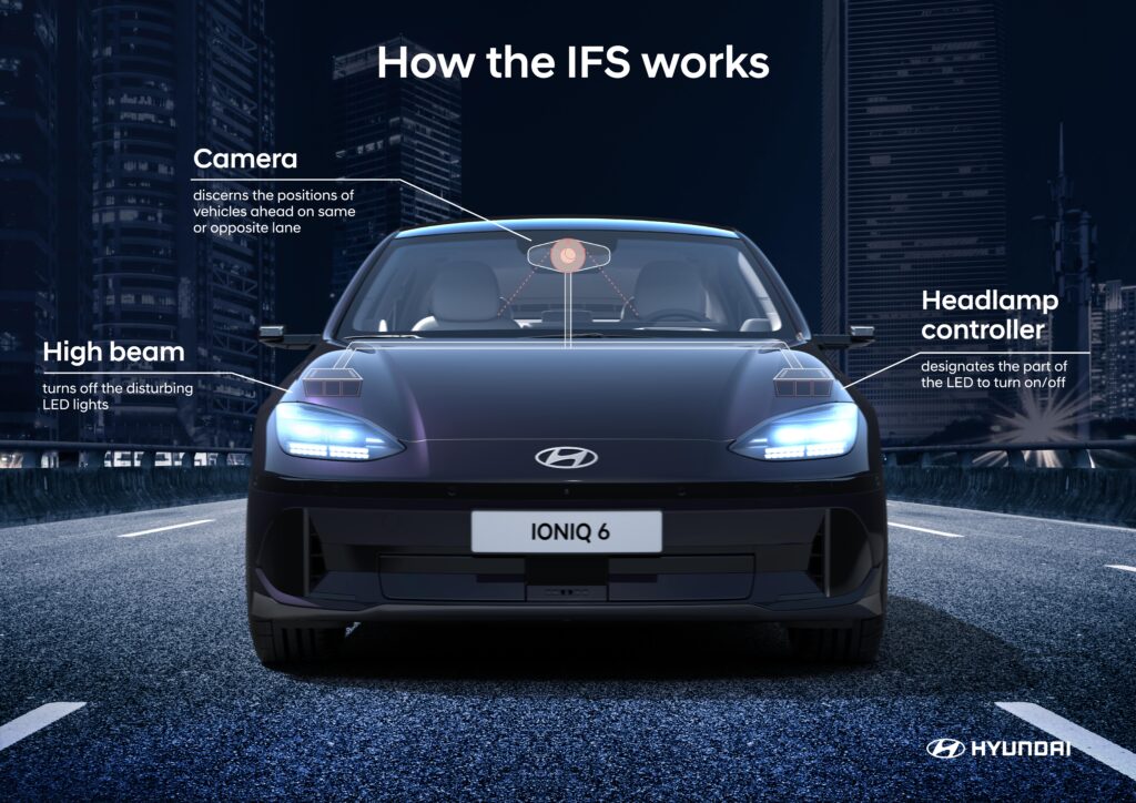 Sistem ima pomembno varnostno vlogo, saj funkcija za uravnavanje zasenčenosti žarometov zagotavlja ustrezno vidljivost tako voznika IONIQ 6 kot preostale udeležence v prometu, saj skrbi tudi za njihov pogled. Sistem uporablja kar zavidljivo število zaznaval, začenši s kamero, ki zazna preostale udeležence in na podlagi njihovega gibanja ustrezno zasenči njihov položaj. IFS sistem ima tako stalno prižgane dolge oziroma nezasenčene žaromete in jih segmentno izklaplja le na lokaciji zaznanih vozil, kolesarjev in pešcev.