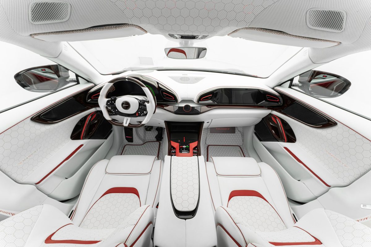 V notranjosti so Mansoryjevi mojstri ustvarili unikatno okolje oblazinjano z usnjem slonokoščene barve in okrašeno z rdečimi poudarki ter vidnimi elementi iz ogljikovih vlaken. Športni volan, vezeni varnostni pasovi, aluminijaste stopalke in podrobne notranje izboljšave odražajo znamkino predanost ustvarjanju razkošne ter individualne vozne izkušnje.