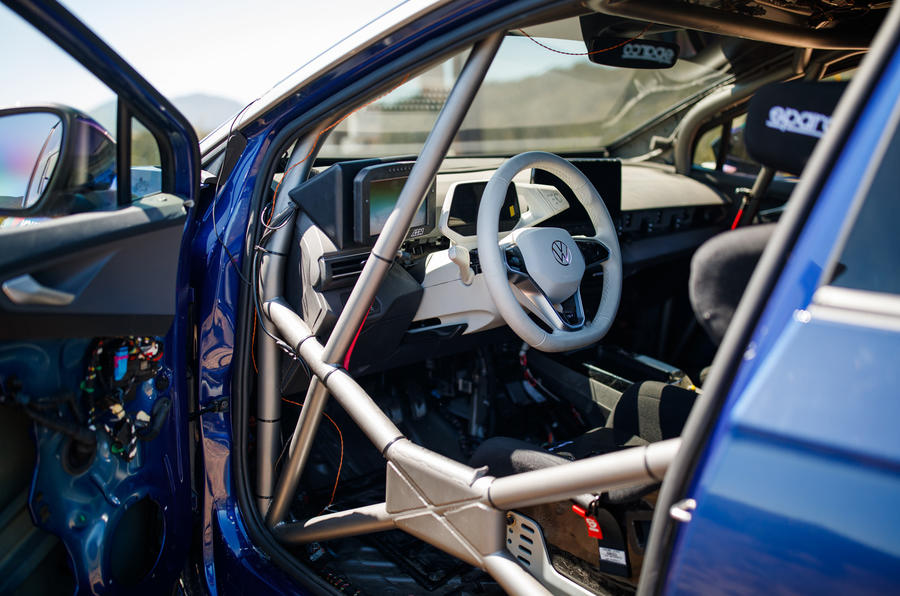 V notranjosti za dodatno varnost poskrbi obvezna varnostna kletka, obenem so za zmanjšanje skupne mase odstranili vso nepotrebno kramo. Dodatni zasloni v kokpitu bodo nujni za lažje navigiranje na ekstremnem terenu. Za volanom divjega Volkswagna ID.4 bo sedel legendarni dirkač Tanner Foust, vlogo kopilota ima Emme Hall.