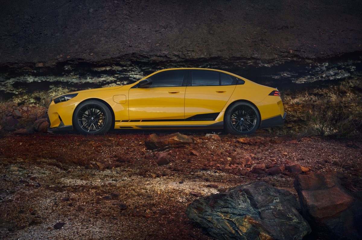 M5 ima zaradi širokih kolotekov in prilagojene zasnove precej mišičaste proporce, ki jih dodatno poudarjajo razširitve pragov M Performance in pokrovi zunanjih ogledal iz ogljikovih vlaken. Vsi karbonski sestavni deli so ročno izdelani z brezbarvnim premazom. Dodatne podrobnosti zajemajo stranske nalepke M Performance v barvi Frozen Black, pokrov antene iz aramidnih vlaken in platišča iz lahke zlitine, ki bodo na voljo od poletja 2025. Katalog M Performance delov nudi tudi dodatke za popestritev notranjosti, kot so posebne prešite talne preproge, pokrov rezervoarja za gorivo iz ogljikovih vlaken in vrečke za pnevmatike z logotipi BMW M, za piko na i poskrbi ovitek za ključe iz črnega usnja.