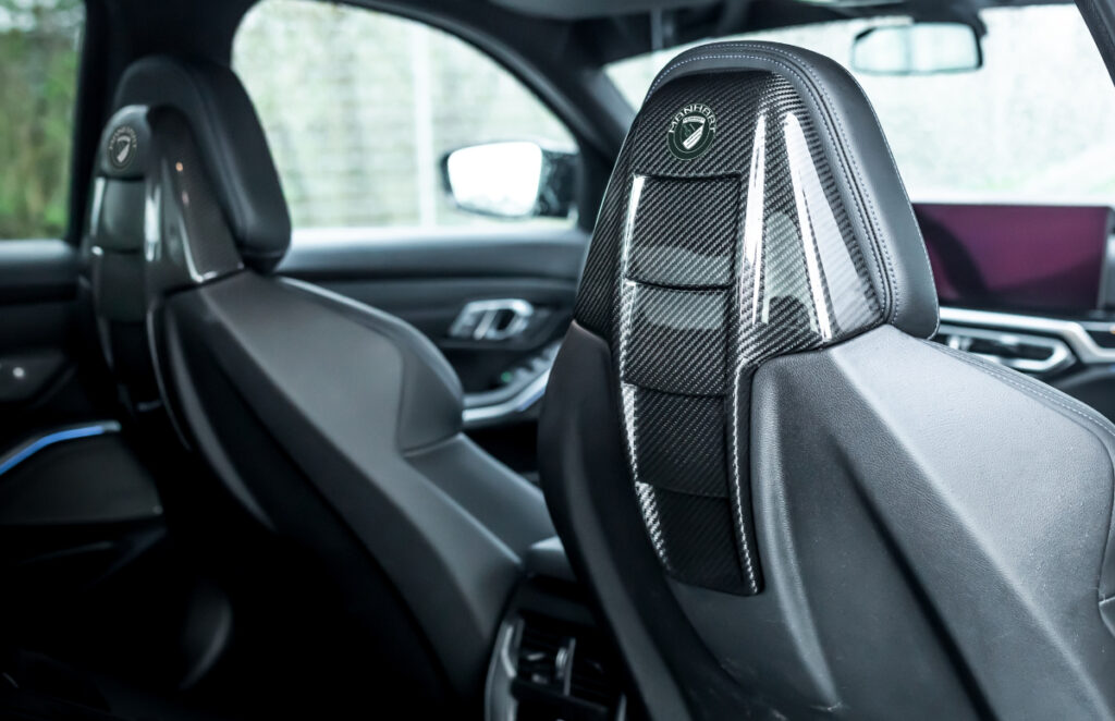 Poleg zmogljivosti so bavarski limuzini namenili tudi več vizualne prisotnosti, kar lahko pripišemo črni karoseriji s kompletom nalepk Manhart s srebrnimi in rdečimi črtami. Za več športnega pridiha poskrbijo karbonski dodatki iz ponudbe M Performance, kot so krilce pod na dnu sprednjega odbijača, manjši spojler na prtljažnih vratih in zadnji difuzor. Kot se za tovrstno predelavo spodobi, so se na vseh štih koncih znašla nova 20-palčna kovana platišča Concave One s petimi dvojnimi kraki in mat črnim zaključkom. Samo držo vozila so izboljšali s 40-milimetrskim znižanjem prednje in 30-milimetrskim znižanjem zadnje osi, z uporabo krajših vzmeti proizvajalca H&R. Spremembam ni ubežala niti notranjost, kjer najdemo M športne sedeže z novimi prevlekami zgodnjega dela hrbtišča, obvolanske prestavne ročice iz ogljikovih vlaken in osvetljene pragove.