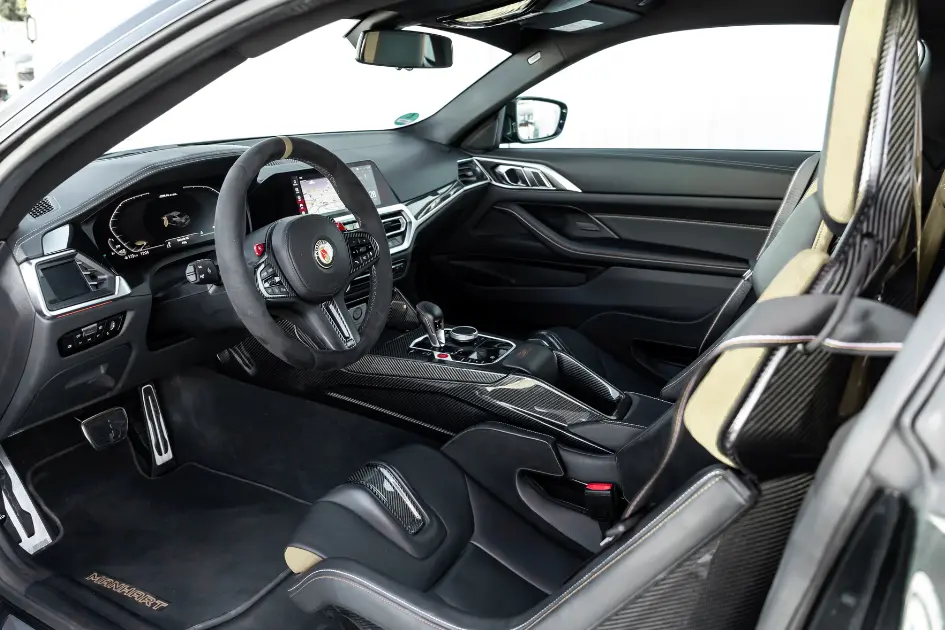 Na zunaj bomo lahko novega MH4 900 prepoznali po izstopajočem karoserijskem kompletu iz ogljikovih vlaken, ki zajema pokrov motorja, masko v slogu modela GTR, aerodinamične letve, stranska krila, pokrova ogledal, zadnji difuzor in oblikovo krilce. Oblikovanje dopolnjujejo nalepke s poudarkom v barvi šampanjca na elegantni črni podlagi. Za lepšo lego na vozišču in ostrejše krmiljenje skrbi nastavljivo vzmetenje H&R, posebna platišča pa merijo 20 palcev spredaj ter 21 zadaj. V notranjosti se nadaljuje skoraj dirkaška tematika z varnostno kletko Clubsport, talne preproge z blagovno znamko pa opozarjajo, da to ni povsem običajni M4.