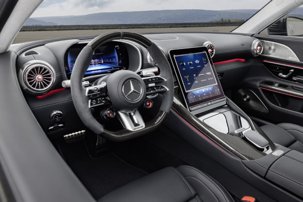 Zdaj pa presedlajmo na razkošje in udobje, ki je v večji meri preslikano iz uvodoma omenjenega modela SL. Kabina bo po novem še bolj razsvetljena, saj bo večja, še posebno bo do izraza prišla z opcijsko panoramsko stekleno streho. Ob pogledu na ambient takoj opazimo velike zračnike in 11,9-palčen osrednji zaslon občutljiv na dotik. Serijsko oblazinjenje ima vgrajeno masažno funkcijo in se zdi bolj ergonomsko kot športno oblikovano, vendar brez strahu. Za doplačilo boste prejeli agresivne športne fotelje, ki vas bodo objeli kot mama ob rojstvu – praktično ji(m) ne morete pobegniti. Prostor izza voznika in sovoznika sicer sprejme dva res majhna potnika, prednostno pa je namenjen shranjevanju prtljage. Sedeža druge vrste lahko tudi zložite in tako pridobite nekaj prostora za potencialne večje nakupe ali manjše pohištvene pakete.