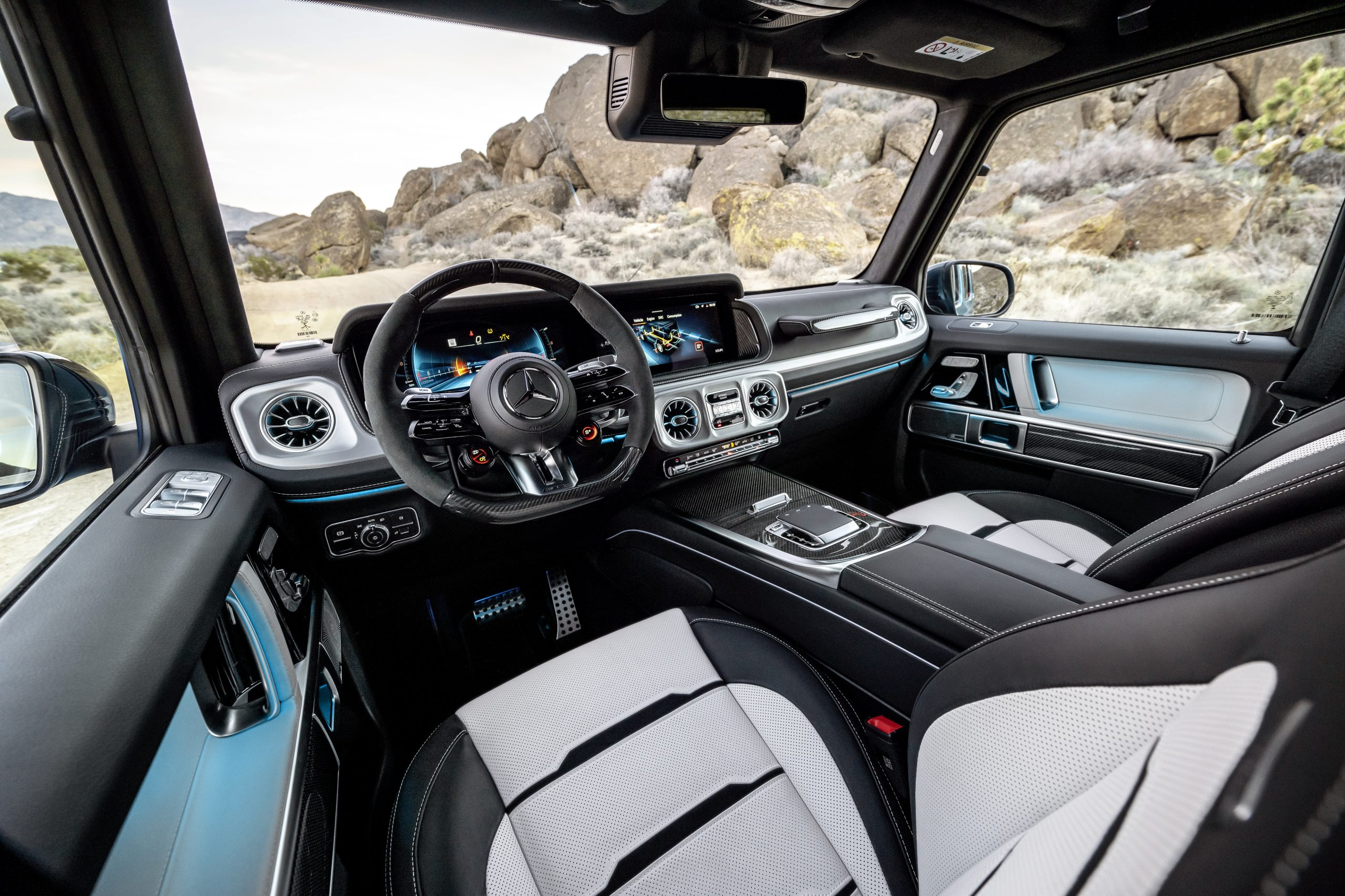 Pod motorni pokrov si je tokrat pot pričakovano utrla 48-voltna tehnologija blagega hibrida. Slednja podpira delovanje pogona v osnovnem G550 kot tudi v nabritem G63 AMG. Prvi ima nameščen trilitrski vrstni šestvaljnik, ki zmore 443 KM in 560 Nm navora, medtem ko se v nabritem G63 AMG modelu nahaja dobro znani štirilitrski twin-turbo V8 agregat s 585 KM in 850 Nm navora. Dovolj, da do stotice pospeši v vsega 4,2 sekunde. Tisti bolj delovno usmerjeni bodo morda posegli po dizelsko gnanemu G450d, katerega trilitrski prisilno polnjeni šestvaljnik zmore 367 KM in zajetnih 900 Nm navora. Še pred vstopom v dejansko leto 2025 pa se nam menda obeta električna različica EQG. Prenovljeni razred G bo še vedno izjemno zmogljiv terenec s tremi zaporami diferenciala, reduktorjem, 30- in 31-stopinjskim vstopnim oziroma izstopnim kotom ter 270 mm oddaljenosti od tal. Terenska naravnanost vozila se bo nadalje odražala tudi na multimedijskem sistemu MBUX z nekaj grafike Transparent Hood, specifične za terensko uporabo.