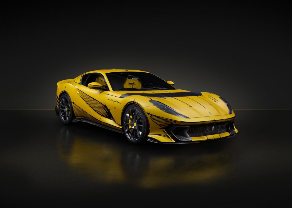 Rumenkasti V12 kupe je tako poln črnih oznak in je tako nastal v čast projektnemu delu Ferrarijevih oblikovalcev, še posebej prvemu med njimi Flaviu Manzoniju. Zgodba prepleta rumene in črne se nadaljuje tudi v notranjosti, prežeti z alkantaro, ki objema tako oblazinjenje kot armaturno ploščo.