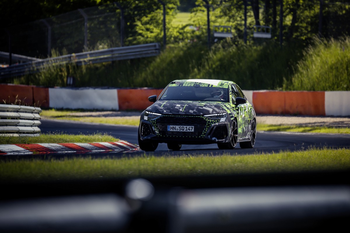 Audi je z novim limuzinskim RS3 na zeleni pentlji postavil nov rekord v segmentu kompaktnih avtomobilov, s časom 7:40.7 so za 4,6 sekunde skrajšali prejšnji rekord Renaulta Megane RS Trophy-R. Nedavno razkritega RS3 je na zahtevni stezi krotil razvojni voznik Frank Stippler, avto pa je vožnjo opravil obut v opcijske, vendar cestno-legalne Pirelli Trofeo R pnevmatike.