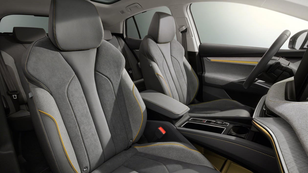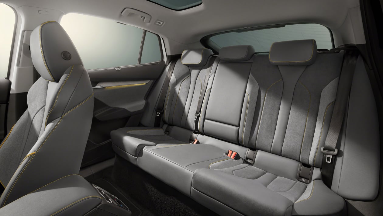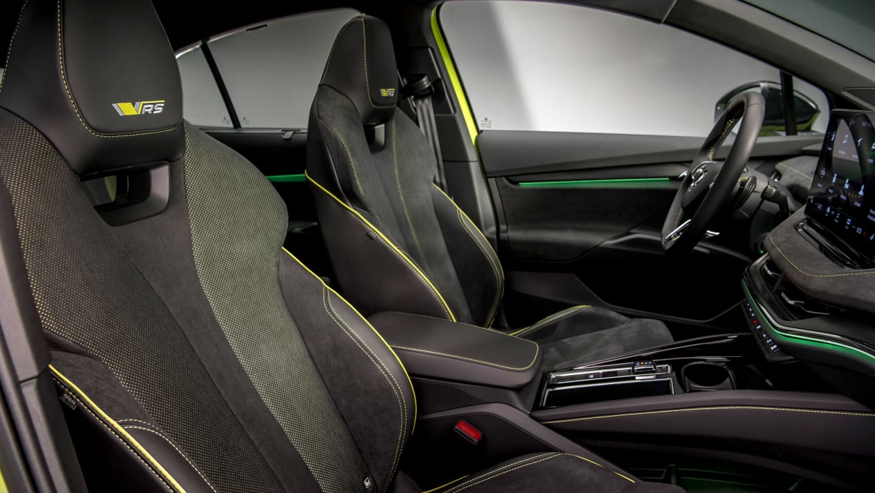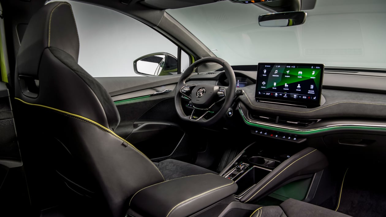 Kot pri pogonu, drastičnih sprememb ne bomo našli v notranjosti, ki ostaja zvesta pospravljeni armaturni plošči z osrednjim 13-palčnim zaslonom in manjšimi 5,3-palčnimi digitalnimi merilniki. Enyaq vRS nas bo razvajal s školjkastimi športnimi sedeži in naborom logotipov, da slučajno nebi pozabili, na njegovo posebnost. Praktično edina razlika se pozna pri rahli okrnjenosti prostora za zadnje potnike in pri volumnu prtljažnika, ki je s 585 litrov padel na 570 litrov.