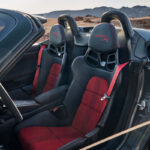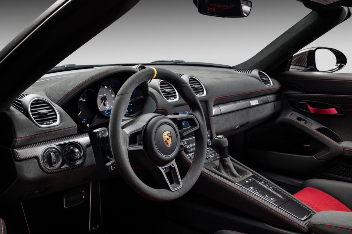 Dirkaško obarvani značaj se nadaljuje v notranjosti Spyderja RS, kjer je vse omejeno na funkcionalnost in ne razkošno udobje. Pred voznikom je nameščen oprijemljiv športni volan, odet v tkanino Race-Tex in s sredinskim prešitjem, za čvrsto sedenje med ostrimi zavoji pa bosta skrbela školjkasta sedeža iz lahkotnega CFRP materiala, oblečena v kombinacijo črnega usnja ter športne tkanine Race-Tex. Poseben občutek bodo pričarali logotipi Sypder RS na naslonih za glavo in notranjih pragovih. Kupci bodo lahko tako kot pri ostalih RS izdelkih izbrali dodaten paket Weissach, ki med drugim vključuje magnezijeva platišča, titanski izpušni sistem, razširjeno oblazinjenje v materialu Race-Tex in oblikovne podrobnosti v slogu modela 935 iz leta 2018. Ekskluzivno bo skupaj z izvrstnim 718 Spyder RS na voljo ujemajoča Porsche Design kronograf ročna ura s titanskim ohišjem in karbonsko številčnico.