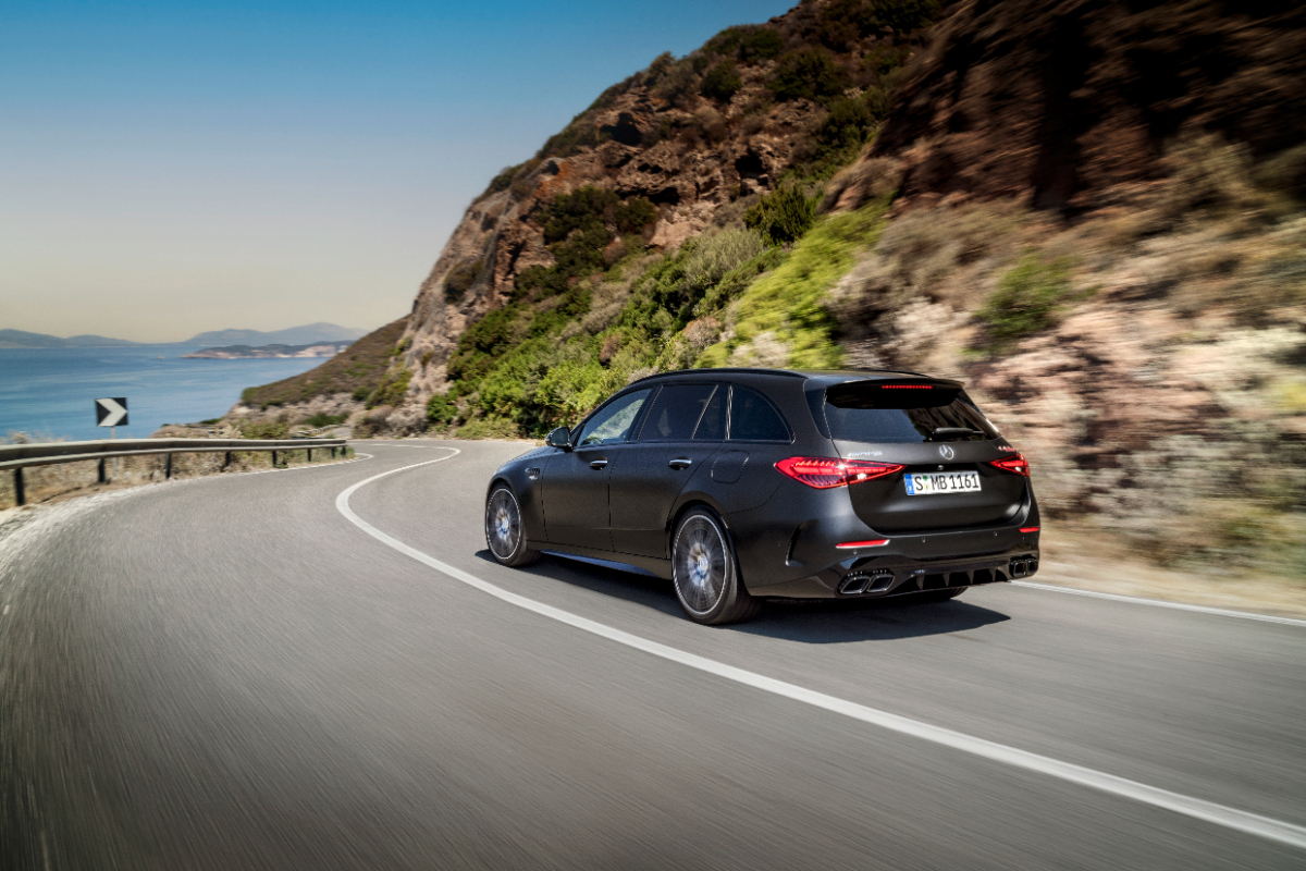 Najprej kar brez odlaganja pokukajmo pod pokrov motorja, kjer tiči najmočnejši serijski štirivaljni motor, vsaj po poročanju Mercedesa. Vzdolžno nameščeno dvolitrsko enoto podpira električni turbopolnilnik, ki moč potiska vse do 350 kW (476 KM), za doseg maksimalnih 680 KM (170 več od predhodnika) in 1.020 Nm navora, pa sta zaslužna še elektromotor na zadnji osi ter kompaktna 6,1 kWh baterija z maso zgolj 89 kilogramov. Izbira priključno-hibridnega pogona je kriva za poskok mase vozila na 2.111 kilogramov oziroma 2.145 kilogramov pri karavanski različici. Vsa ustvarjena moč se preko devetsopenjskega samodejnega menjalnika prenaša na vsa štiri kolesa, tako se novi C 63 S E-Performance do stotice izstreli v 3,3 sekundah in doseže najvišjo hitrost 250 km/h (280 km/h z opcijskim paketom).