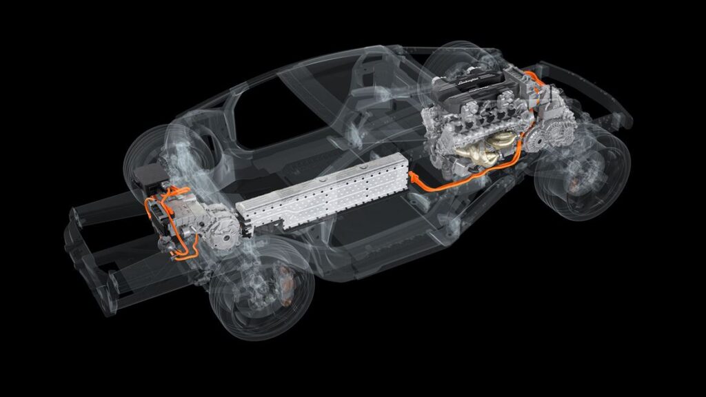 Električna energija bo shranjena v bateriji s kapaciteto 3,8 kWh, nameščeni v sredinskem tunelu, kar poskrbi za nizek center težišča in posledično boljšo razporeditev mase. Ko bo le ta v celoti izčrpana, jo bo mogoče iz zunanjega vira z največjo močjo 7 kW napolniti v 30 minutah, z regenerativnim zaviranjem ali neposredno iz V12 motorja se bo napolnila v zgolj šestih minutah. Zelo pomembna pridobitev naslednika Avnetadorja bo osemstopenjski dvosklopčni menjalnik, ki bo precej hitrejši od Huracanove sedemstopenjske enote in manj brutalen od starega avtomatiziranega ročnega menjalnika, prav tako mu manjka vzvratna prestava, to nalogo bodo prevzeli elektromotorji.
