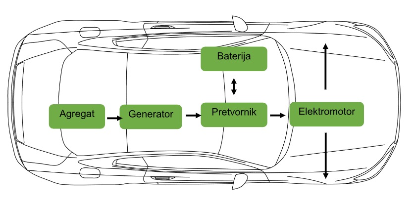 Pri postavitvi pogona se opis nanaša na način prenosa moči na kolesa. Pri zaporedni (serijski) postavitvi je elektromotor tisti, ki vedno poganja kolesa, medtem ko (navadno manjši) agregat opravlja izključno vlogo električnega generatorja in s tem polnjenja baterije. Agregat tako deluje zgolj kot »podaljševalec avtonomije« (ang. range extender) in ne poganja koles. Prednosti serijske postavitve pogona so optimizacija obratovanja agregata, enostavna izvedba in možnost vožnje zgolj na elektriko, medtem ko med pomanjkljivosti štejemo izgube pri pretvorbi energije ter višjo maso zaradi vseh komponent (moč pogona je omejena z močjo elektromotorja). Njegova uporaba je najbolj smiselna v gostem mestnem prometu.