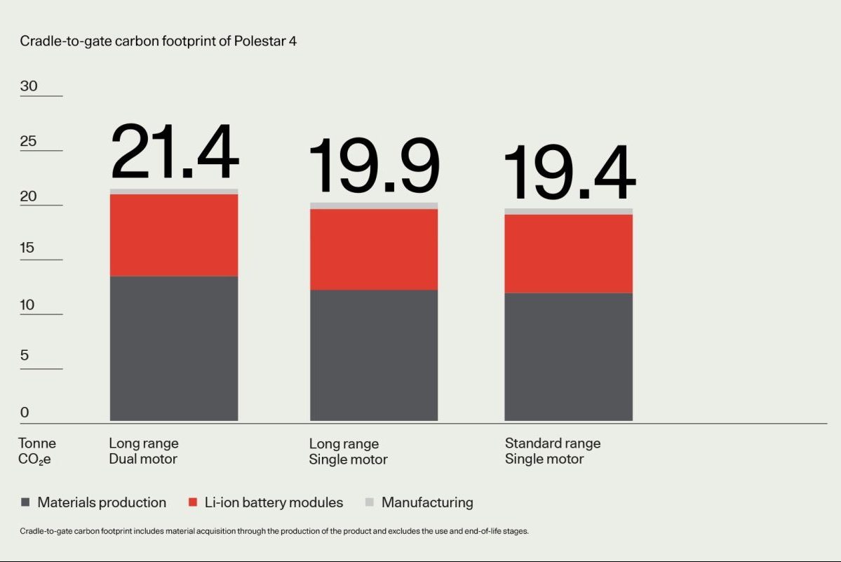 Impresivni rezultat gre pripisati različnim trajnostnim ukrepom, sprejetim med proizvodnjo modela Polestar 4, ki poteka v tovarni SEA družbe Geely Holdings v zalivu Hangzhou na Kitajskem. Tovarna koristi zeleno električno energijo iz obnovljivih virov, vključno z električno energijo iz hidroelektrarn s certifikatom I-REC in fotovoltaično energijo, proizvedeno na strehi tovarne. K povečanju tega odstotka pripomorejo uporaba ekološko pridobljenega aluminija, taljenega v tovarnah na okolju prijazno pridobljeno električno energijo. Prvič so bili v izračun življenjskega cikla vključeni podatki o uporabi recikliranega aluminija, kar poudarja Polestarjevo zavezanost transparentnosti in trajnostni prihodnosti. Analiza razdeli ogljični odtis na različne komponente, kar razkriva, da aluminij predstavlja 24 odstotkov odtisa, jeklo in železo 20 odstotkov, največji delež, skoraj 40 odstotkov pa predstavljajo baterijski moduli.