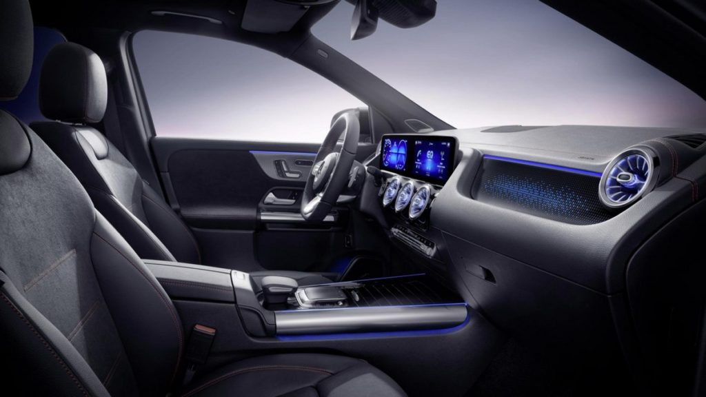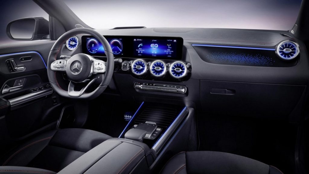 Pogled v notranjost nas hitro spomni na GLA, saj je v večini nespremenjena. Osrednja točka ostaja MBUX informacijski panel z dvema zaslonoma, serijsko 7-plačnima, vrh predstavljata 10,25-palčni širokozaslonski enoti. Edina bistvena razlika je program Electric Intelligence vgrajen v navigacijski sistem, ki izračuna najbolj učinkovito pot in ob približevanju hitre polnilnice predgreje baterijo na optimalno temperaturo. Ko smo že pri polnjenju, EQA ima serijsko vgrajen 11 kW AC in hitrejši 100 kW DC priklop. V najboljšem primeru polnjenje med 10 in 80 odstotki traja le 30 minut.