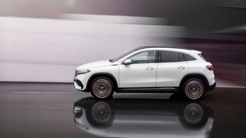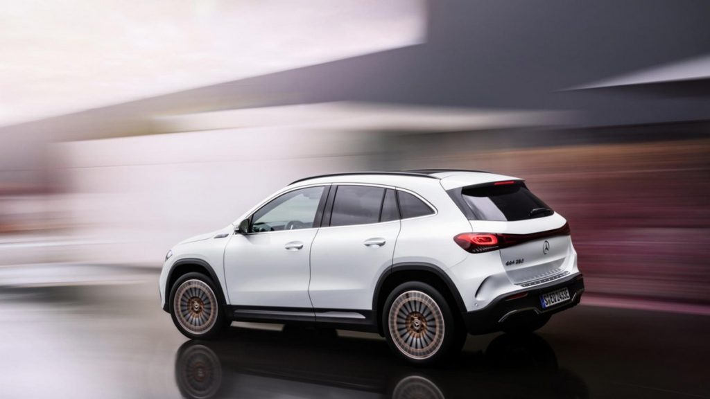 Prav ste uganili, Mercedesov novinec je v bistvu preoblikovana in elektrificirana različica križanca GLA. Nanj zelo spominja tudi iz oblikovnega vidika, vsekakor pa ima ogromno samosvojih podrobnosti, ki ga naredijo unikatnega in bolj modernega v primerjavi s klasično gnanim bratom. EQA značilnosti lahko opazimo pri očrnjeni zaprti maski in novi osvetlitvi, vključno z dolgim svetilnim elementom zadaj – značilen svetlobni podpis električnih EQ modelov. Zglajena zunanjost pripomore k zmanjšanju koeficienta zračnega upora, kljub videzu križanca znaša le 0,28 Cd. K aerodinamiki dodatno pripomore skoraj popolnoma ravno dno vozila in optimizirana platišča, kot so privlačna rožnato-zlata 20-palčna na razstavnem modelu, serijsko sicer sedi na 18-palčnih.