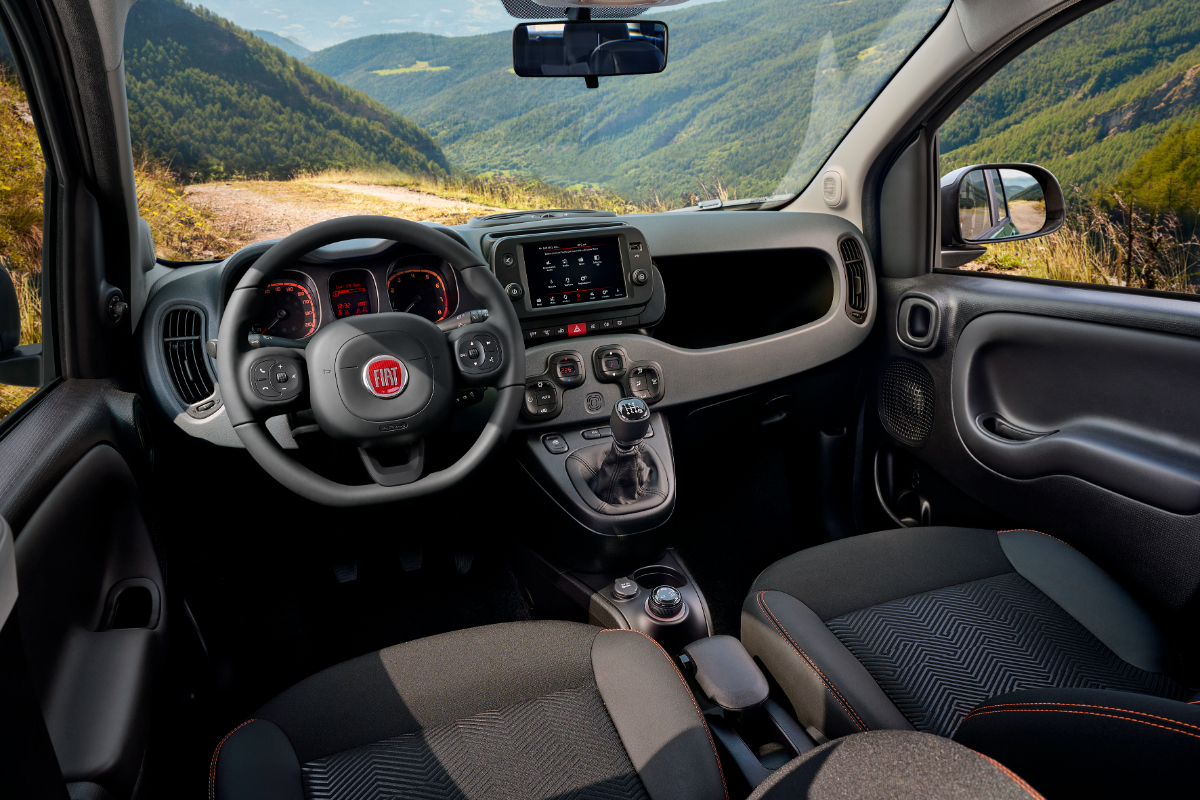 Manjši Pandi Garmin so nadeli črno obarvana 15-palčna platišča, večji Tipo sedi na 17-palčnem kompletu. Tematika oranžnih detajlov se nadaljuje ob vstopu v notranjost, kjer obarvani šivi popestrijo sedeže odete v črno blago, dodatno pomagajo še Garmin logotipi na naslonih. Kot standardno je zelenkasta Panda opremljena z avtomatsko klimatsko napravo, digitalnim radiem in 7-palčnim informacijskim zaslonom s podporo Apple CarPlay ter Android Auto.