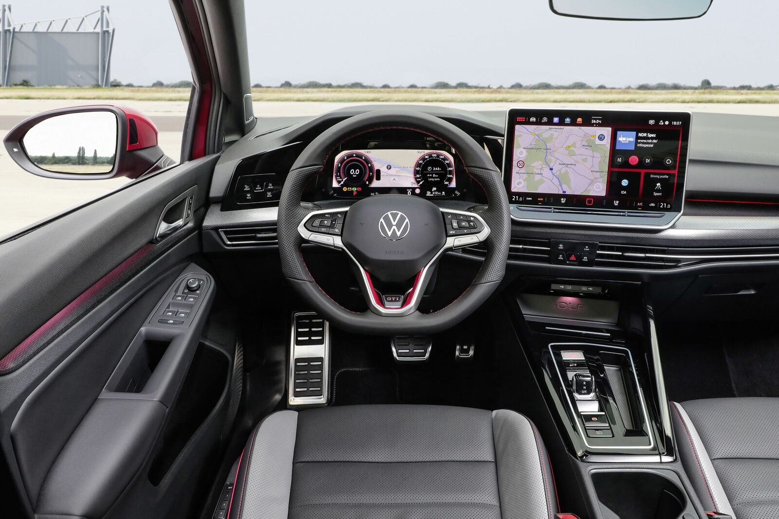V notranjosti Golf GTI ponuja vrhunsko udobje s športnimi sedeži, ki jih krasijo rdeči okrasni šivi, opcijski paket usnja pa poveča razkošje. Ekskluzivne značilnosti modela GTI vključujejo utripajočo rdečo tipko za zagom in stopalke iz brušenega nerjavnega jekla, ki jih dopolnjujeta črno oblazinjenje stropa in izboljšan Digital Cockpit Pro. Novi infozabavni sistem, ki se upravlja prek 12,9-palčnega zaslona na dotik, zagotavlja brezhibno integracijo navigacije in zabavnih vsebin, poleg tega glasovni pomočnik IDA, ki ga poganja programska oprema ChatGPT na osnovi umetne inteligence, omogoča intuitivno upravljanje in odgovarja na zahtevnejša vprašanja.