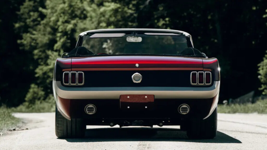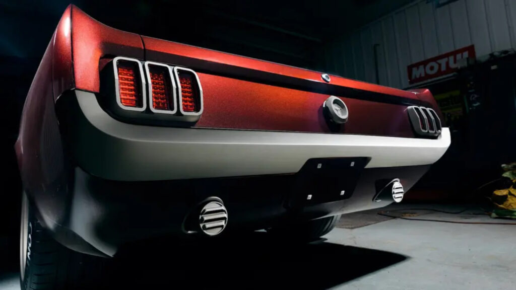 Od tu gremo naprej proti celostno preoblikovani karoseriji, ki je zrasla v vseh pogledih in spremenjeni sprednji maski, nameščeni 5 centimetrov globlje kot pri originalnem avtomobilu. Kljub vsem obsežnim spremembam zunanjost nekako izgleda čisto pravilno, kar je bistvo takšnega Mustanga, ki po 4.200 urah vloženega dela ohranja proporcije originala, čeprav je vsak sestavni del drugačen. Edini preživeli oziroma pristni deli so pokrovčki na sredini platišč.