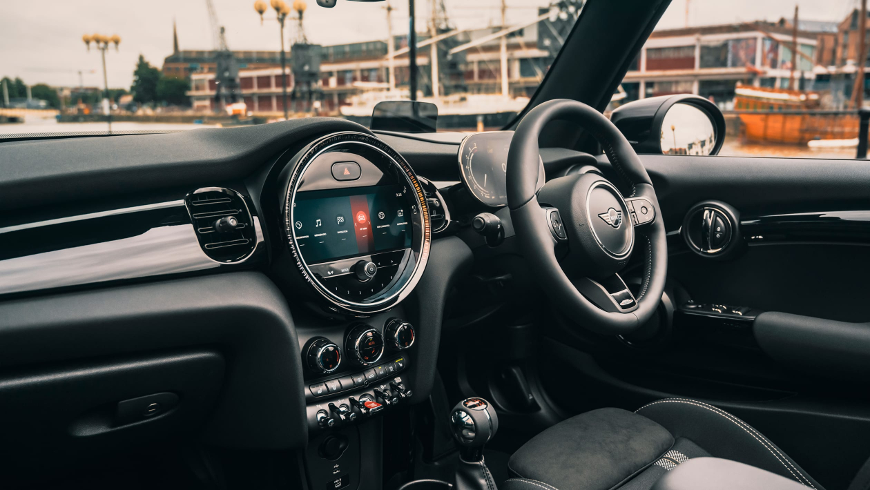 V notranjosti se vsi trije temačni Minije pohvalijo za antracitno obarvanim stropom, klavirsko črnimi okrasnimi elementi armaturne plošče in unikatnimi notranjimi pragovi vrat. Standardne sedeže so nadomestili športni JCW, prav tako je bolj športne volan. Poleg kozmetičnih popravkov Shadow Edition prinaša bogatejšo opremo – večji 8,8-palčni informacijski zaslon, samodejne brisalce s senzorjem za dež, avtomatske žaromete in pameten sistem klica v sili.